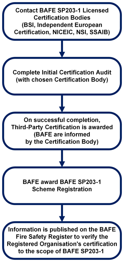 BSI (British Standards Institution), Independent European Certification Limited, NICEIC (Certsure), NSI (National Security Inspectorate), and SSAIB (Security Systems Alarm Inspection Board) are the UKAS Accredited Certification Bodies that are licensed by BAFE to deliver BAFE SP203-1 Scheme audits. Please contact the Certification Bodies directly to discuss the BAFE SP203-1 audit process, fees, and any other information required.